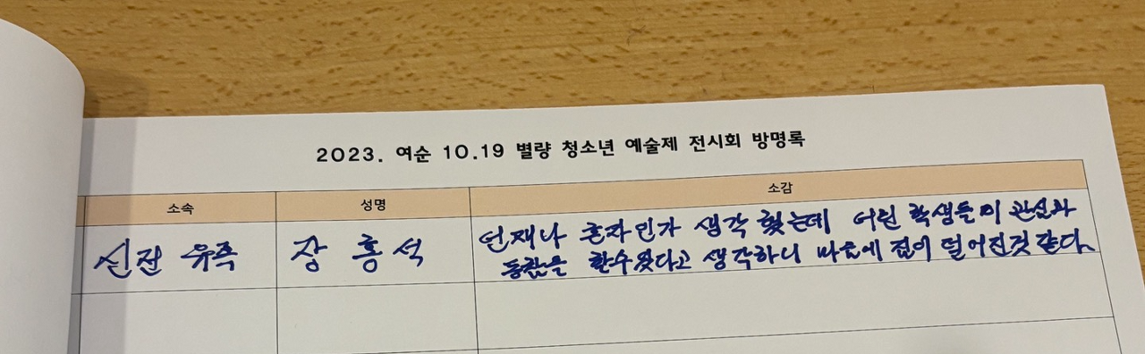 예술제를 둘러보며 저도 하지 못한 일들을 아직 어린 중학생들이 역사에 관심을 갖고 유족민들의 아픔에 동참했다는 것에 기특하고 대견하였습니다. 앞으로도 여순 10.19사건에 대해 더 많은 학생들이 수업을 받을 수 있는 기회가 많아져서